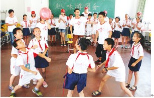 11日,福建工程学院20名大学生组成的暑期社会实践队来到邵武市越王小学,开展“情暖留守儿童,工院学生送温暖”活动。他们与孩子们一同进行趣味游戏、手把手教孩子学手语、举办关于梦想的交流会等,有针对性地对几名贫困留守儿童进行走访,并送上书包等学习用品,为留守儿童的暑假增添欢乐。图为趣味顶气球游戏让孩子们欢笑不断。