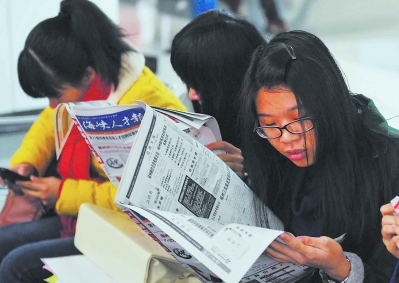 学子们在仔细研究报纸上的招聘信息。