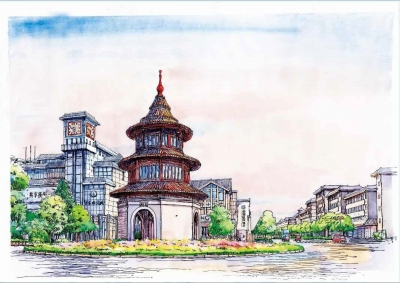 “画种属于钢笔淡彩,先用钢笔画好然后再运用水彩上色。”谈及创作过程,黄巧敏介绍,“先选景、选图,根据选图进行构图取舍,其次用铅笔勾勒透视,然后运用油性水笔画出钢笔线稿,最后用水彩颜料上色。”