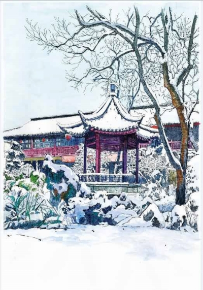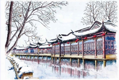 将古城用这样的方式呈现,确实也需要动一番心思。“因为我本身是学景观设计的,专业上对钢笔画也有一定要求,平时也很喜欢画,一幅画需要一天左右时间来完成。”黄巧敏介绍,“最难画的应该是雪景,因为雪景平时很少涉及,也算是首次尝试,在开始画雪景的时候还特意去查找了一些手绘大师绘画雪景的图,临摹学习。”黄巧敏认为,冬天的扬州冶春,画出雪景才更显江南的秀气。“开始创作扬州的两张雪景,画好钢笔画之后,为了上色,失败了一次,尝试两张才觉得满意。”黄巧敏介绍,“个园的雪景就上了三张颜色,最后选了自己感觉比较满意的一张,虽然难,但是白雪皑皑的景色,更能看出一个城市的季节美。”