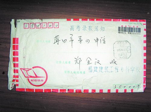 1994年,郑金汉的母校更名为“福建建筑高等专科学校”。2000年,组建为现在的“福建工程学院”。前一阵,郑金汉曾经的老师筹备校庆,寻找当年信物。郑金汉拿出了保存二十多年的《新生入学报到注意事项》、《代办费通知》,及录取通知书快件封面。“时代变迁,往事却历历在目。”郑金汉说,那时候的农家学子,就靠一张录取通知改变命运。