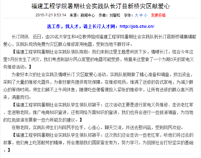 长汀网2015.7.21:福建工程学院暑期社会实践队长汀县新桥灾区献爱心