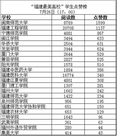 本报讯 (东南网记者 周艾连)“福建最美高校”学生点赞榜活动进行过半,吸引近10万人次参与,22所高校师生也是想方设法为母校拉票,福建中医药大学、福建师范大学协和学院等还制作点赞指南,方便校友参与。截至7月26日17时,闽南师范大学、福建工程学院分列点赞榜冠、亚军。