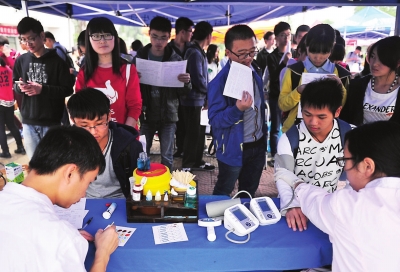 昨日上午,福州的天阴沉沉的,飘着细雨,气温有点低,但福建工程学院旗山校区南、北校区文化广场的气氛却十分火热,学子们纷纷挽袖献血。当天,有229名工程学子成功献血,共计捐献7万多毫升血液。