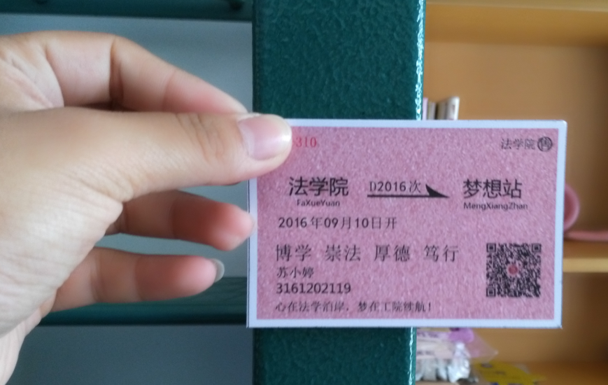 法学院为迎接新生,鼓励16级新生努力实现自己的梦想,特意设计出“梦想火车票”。据了解,在拿到梦想火车票前,16级新生可将自己大学的梦想或者学习规划写下来,然后挂到许愿树上,而这棵许愿树也将由学院保管,用以检验同学们四年后是否不负光阴、成功到站。