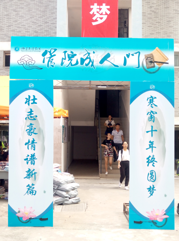 在新生宿舍区,记者看到一个蓝白基调的“成长门”。据悉,该校管理学院此次共设“管院成长门”两个,一个位于女生宿舍楼谦园,一个位于男生宿舍楼知园。成长门高3.1米宽2.5米,两侧写着“寒窗十年终圆梦,壮志豪情谱新篇”的字样。