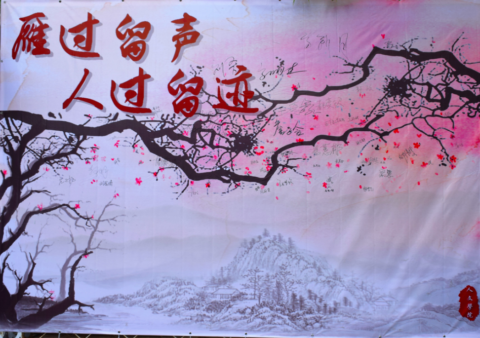 “梅花香自苦寒来,十年寒窗今朝梦;雁过留声砥品行,学习修身传佳音。欲寄语新生保持本色砥砺前行,修身品行胜过万卷书。故取名雁过留声,人过留迹。”谈及对梅花·梦想墙的设想,人文学院团委书记胡家保接受采访如是说。“我希望2016级新生不忘高考寒窗之志,砥砺前行实现梦想。但是实现梦想之首要,就是锤炼好的品行,以后才能成大器。”