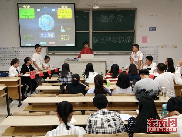 东南网10月9日讯(本网校通讯社大学生记者郑曼颖)10月9日晚,法学院于我校旗山北校区北教四-101与102举办新生辩论赛。本次活动由法学院团委学生会主办,学习部承办,并特邀优秀辩手付曦、赵志鹏担任评委。此次比赛得到了同学们的广泛关注,16级新生积极参与本次辩论赛。
