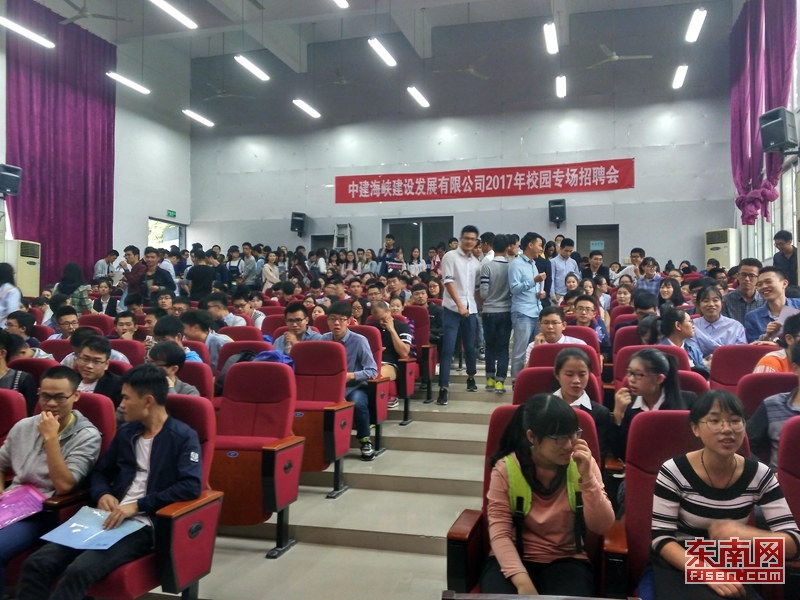 东南网10月13日讯(本网大学生记者郭小锋)10月12日,中建海峡建设发展有限公司2017年校招宣讲会在福建工程学院旗山校区就业报告厅举办。本次招聘会吸引了工程造价、工程管理、土木工程、材料科学与工程、会计学等众多专业500余名应届毕业生前来应聘,宣讲会还没开始,现场就已座无虚席。