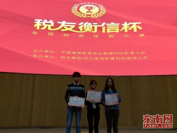 东南网11月23日讯(本网校通社大学生记者宋易颖)11月20日,由中国高等教育学会高等财经教育分会主办的第二届“税友衡信杯”全国税务技能大赛(本科组) 总决赛在杭州落下帷幕。福建工程学院管理学院2014级会计学专业鲁晓娟、包晓晶和王江龙三位学生在杨幼珠老师和胡盛昌老师的指导下,经过紧张激烈的角逐,表现优异,在个人岗位专项技能赛中获得第一名,最终以第三名的综合成绩荣获本科组一等奖。并且,三位学生获得两年内入职税友集团•浙江衡信教育科技有限公司的免试录用通知书。