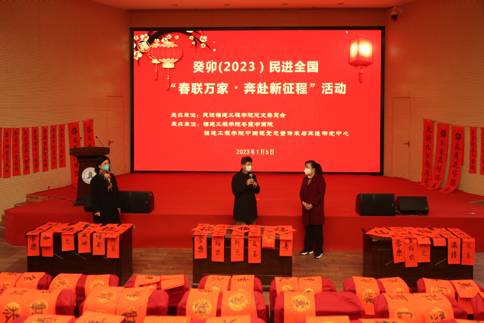 1月5日上午,民进福建工程学院总支响应民进中央开展“春联万家•奔赴新征程”活动的号召,在学校学术报告厅举办以“喜迎癸卯新春 共祝国泰民安”为主题的写春联、送春联活动,喜迎新春佳节来临。校党委副书记詹松青、副校长何仕,统战部负责人、相关部门负责人、校民进会员以及部分教职员工参加活动。