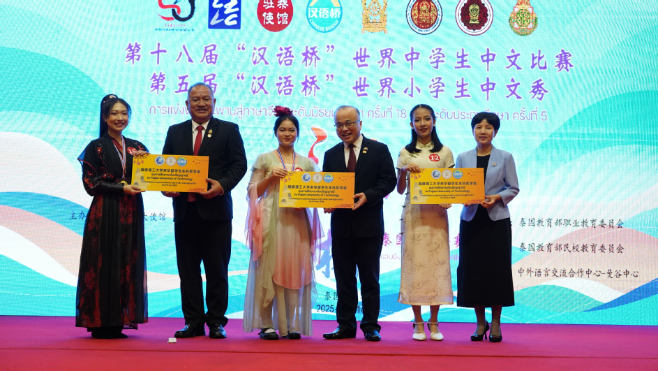 访问期间,代表团还观摩了2025年第十八届“汉语桥”世界中学生中文比赛、第五届“汉语桥”世界小学生中文秀泰国赛区决赛。徐子青与中国驻泰国大使馆临时代办吴志武、泰国教育部职业教育委员会秘书长尤萨蓬·韦努科塞在颁奖典礼上共同为获得中学组前三名选手颁发了“福建理工大学来华留学奖学金”。
