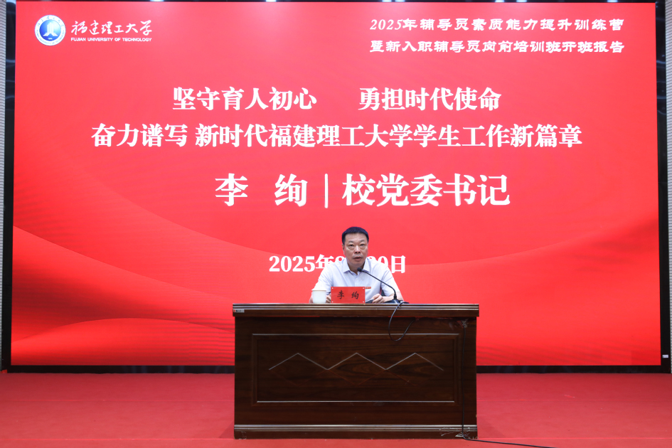 在开班仪式上,李绚充分肯定了近年来学校学生工作所取得的显著成效,表达了对全体辅导员队伍的深切关怀,并对新入职辅导员表示热烈欢迎。他以《坚守育人初心勇担时代使命奋力谱写新时代福建理工大学学生工作新篇章》为题,深刻阐述了新时代学生工作的战略价值和现实意义,对下一阶段工作提出五点要求:一要在强化思想引领上实现新突破。要扎实推进“时代新人铸魂工程”,创新思政工作阵地、载体与方式,引导学生在服务国家与新福建建设的生动实践中坚定理想信念、厚植家国情怀;二要在深化精准服务上展现新作为。要持续完善“一站式”社区育人功能,构建更加系统的学生发展支持体系,提供个性化、菜单式指导与帮扶,推动管理和服务资源下沉,畅通育人“最后一公里”;三要在繁荣校园文化上打造新亮点。要深入凝练福工精神文化内核,加强校园环境文化建设,拓展文明校园内涵,打造文化育人精品,不断提升师生文明素养和校园文明程度;四要在筑牢安全底线上取得新成效。要牢固树立和践行总体国家安全观,常态化、制度化开展学生安全教育和风险隐患排查整治,提升应急处突能力,坚决守牢校园安全防线;五要在服务发展大局上激发新活力。要立足学校发展新起点、新形势、新要求,深入实施“六大强校战略”,加强团结协作与融通联动,为学校高质量发展汇聚力量。