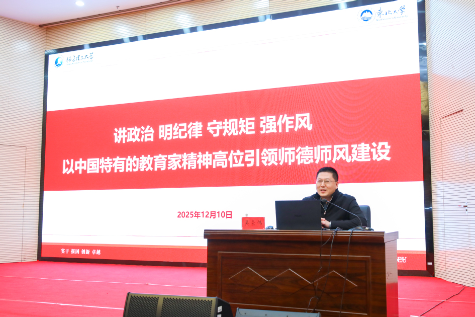 吴豪伟以《讲政治、明纪律、守规矩、强作风——以中国特有的教育家精神高位引领师德师风建设》为题,围绕弘扬教育家精神、严明纪律和规矩、剖析典型案例、涵养风清气正教书育人环境等四个维度进行了深刻阐述。报告主题鲜明、内涵丰富、案例鲜活、发人深省,既有对教育家精神的系统阐释,也有对党纪党规的精准解读,对与会人员深刻理解“讲政治、明纪律、守规矩、强作风”有极强的指导作用。