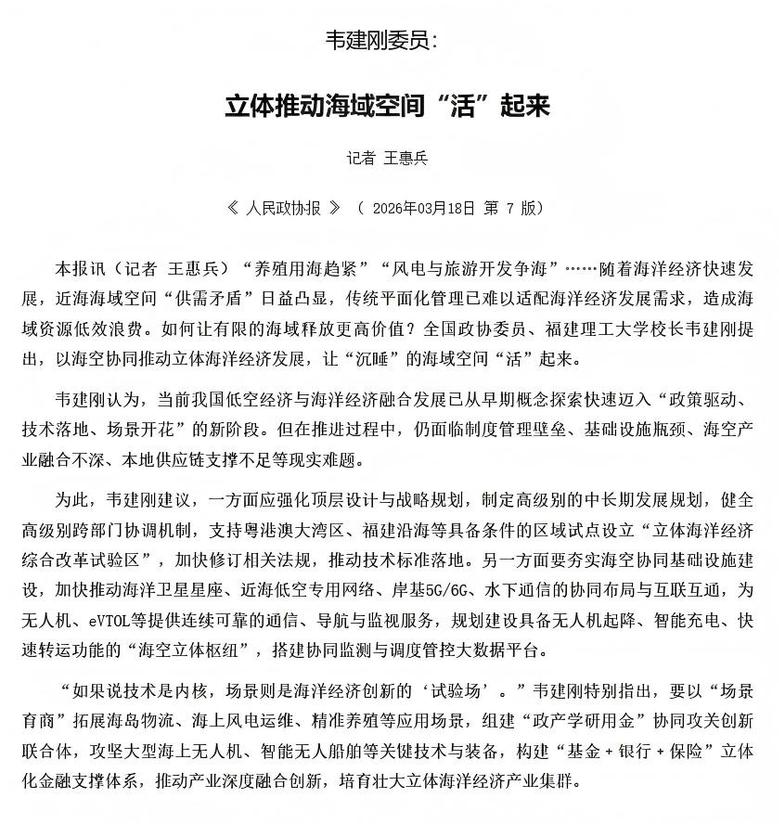 【人民政协报】2026.03.18:韦建刚委员:立体推动海域空间“活”起来